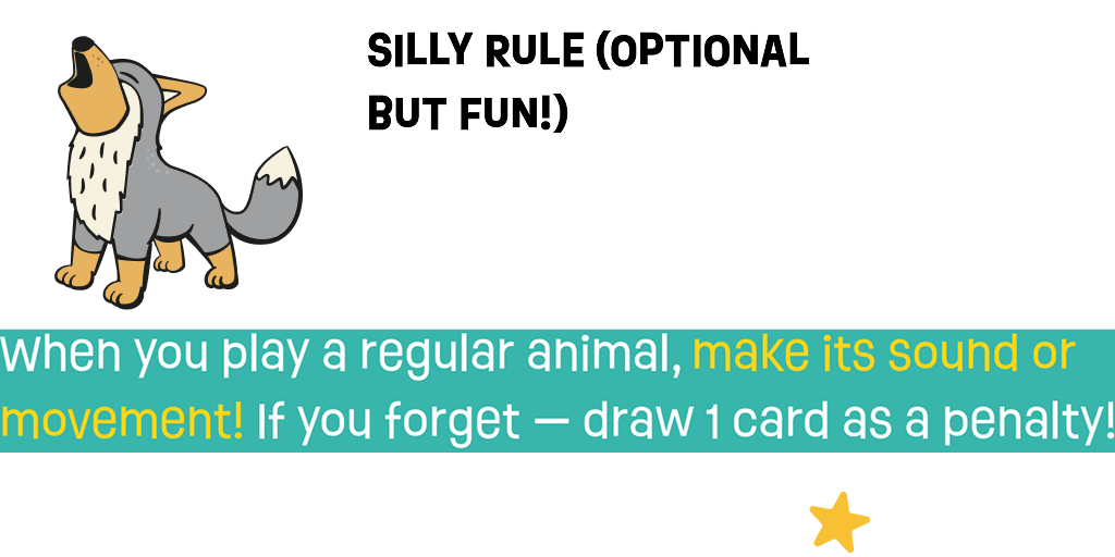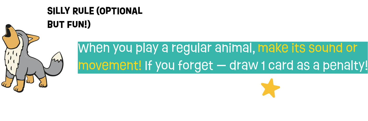 Be the first player to get rid of all your cards by matching animals or colours, and using powerful Star Cards to outplay your opponents with a mix of strategy and silly sounds (optional)!